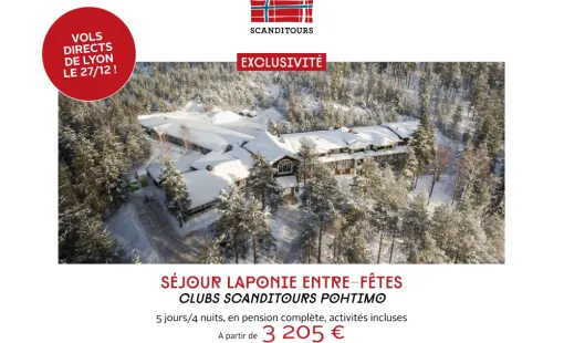 Partez avec l'agence de voyages Un Monde d'émotions avec une OFFRE CLUB POHTIMO VOL DIRECT DE LYON POUR LA LAPONIE FETES DE FIN D'ANNEE AVEC ACTIVITES INCLUSES…